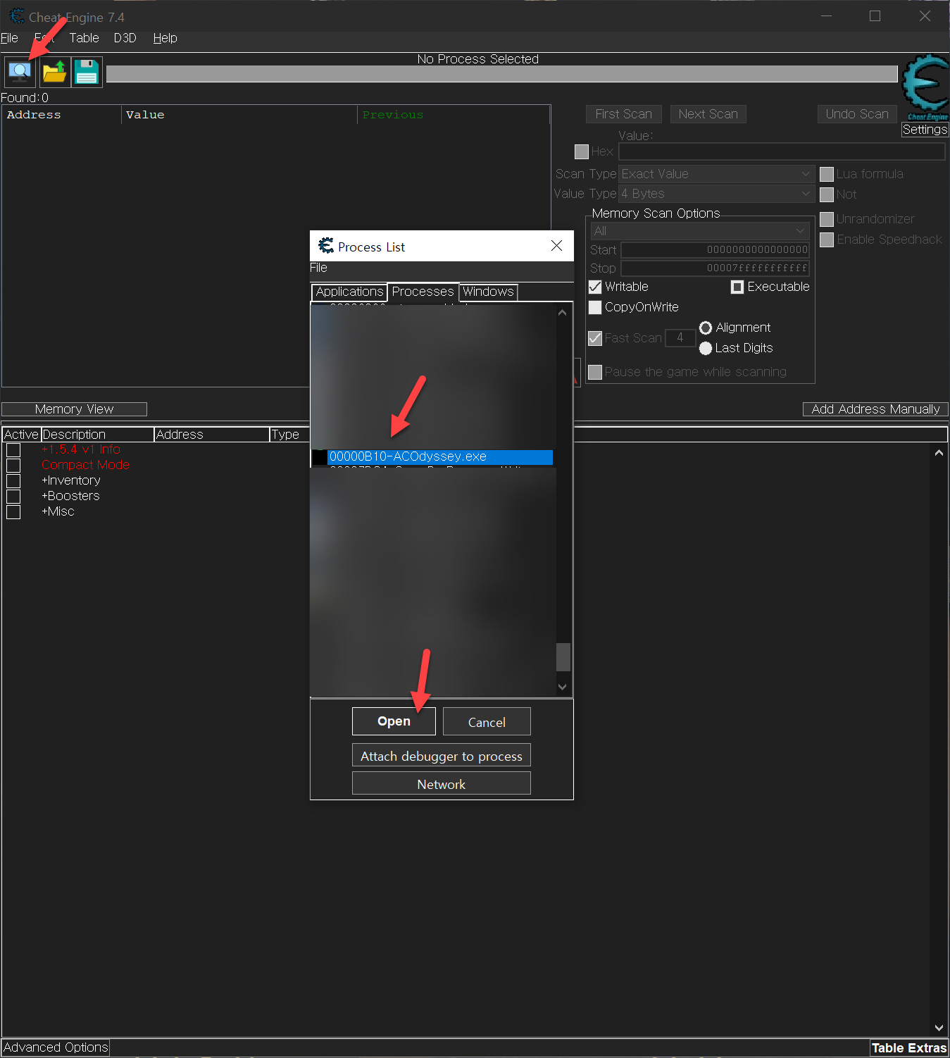 왼쪽 위에 프로세스 선택을 누르고 프로세스 리스트에서 오딧세이 실행파일을 선택하고 open 을 누릅니다