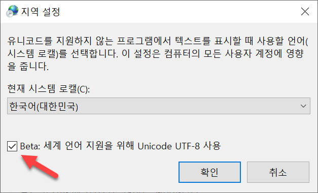 아래 그림처럼 Beta: 세계 언어 지원을 위해 Unicode UTF-8 사용 에 체크를 해주고